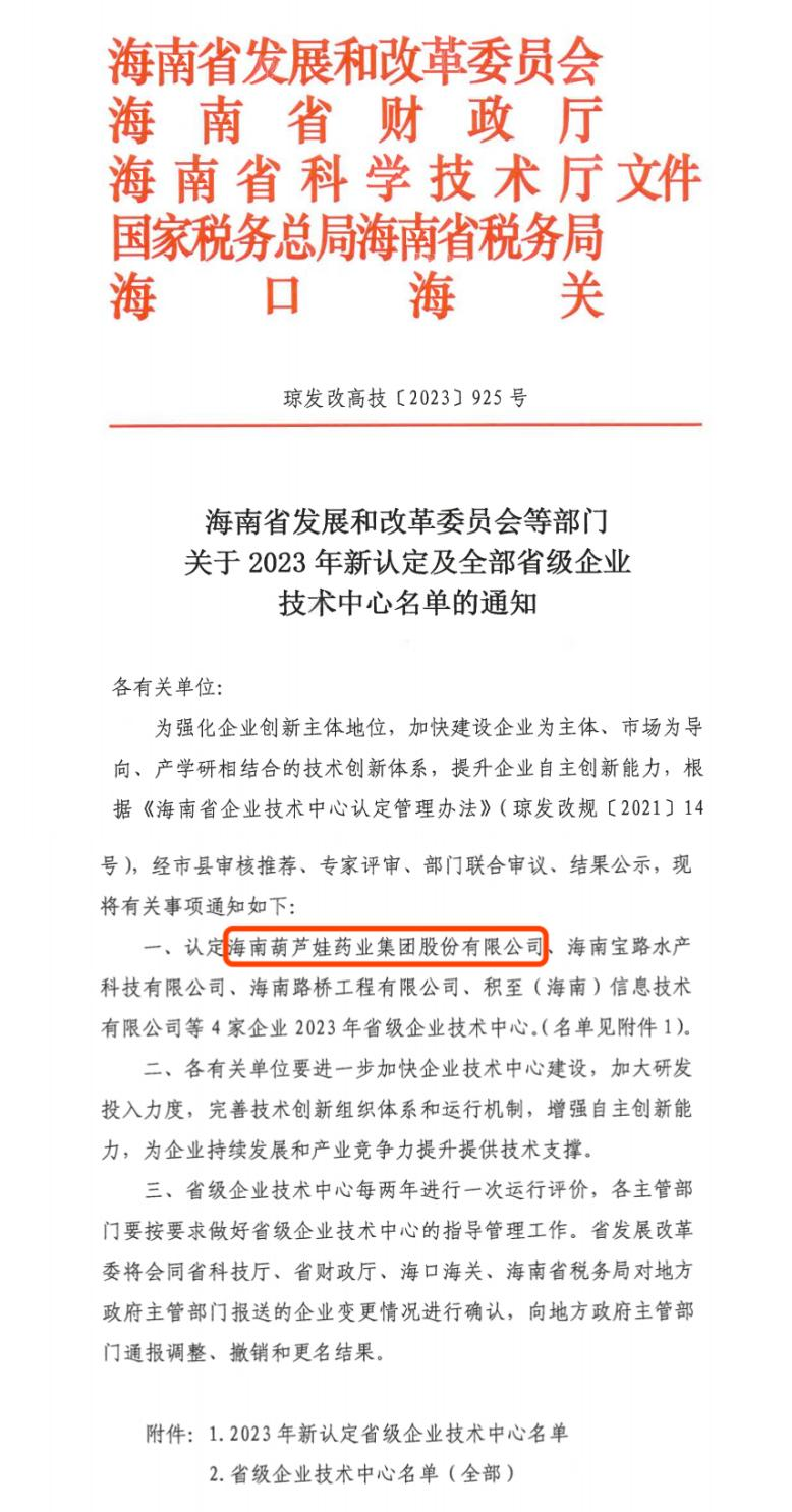 近日,海南省发改委等多部门联合公布了《关于2023年新认定及全部省级企业技术中心名单的通知》,其中,海南南宫28药业集团股份有限公司成功通过评审,被认定为省级企业技术中心,是本次获批的4家企业之一。